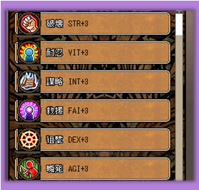 基本能力値(STR/VIT/INT/FAI/DEX/AGI)の上限値が20ポイント増加します。